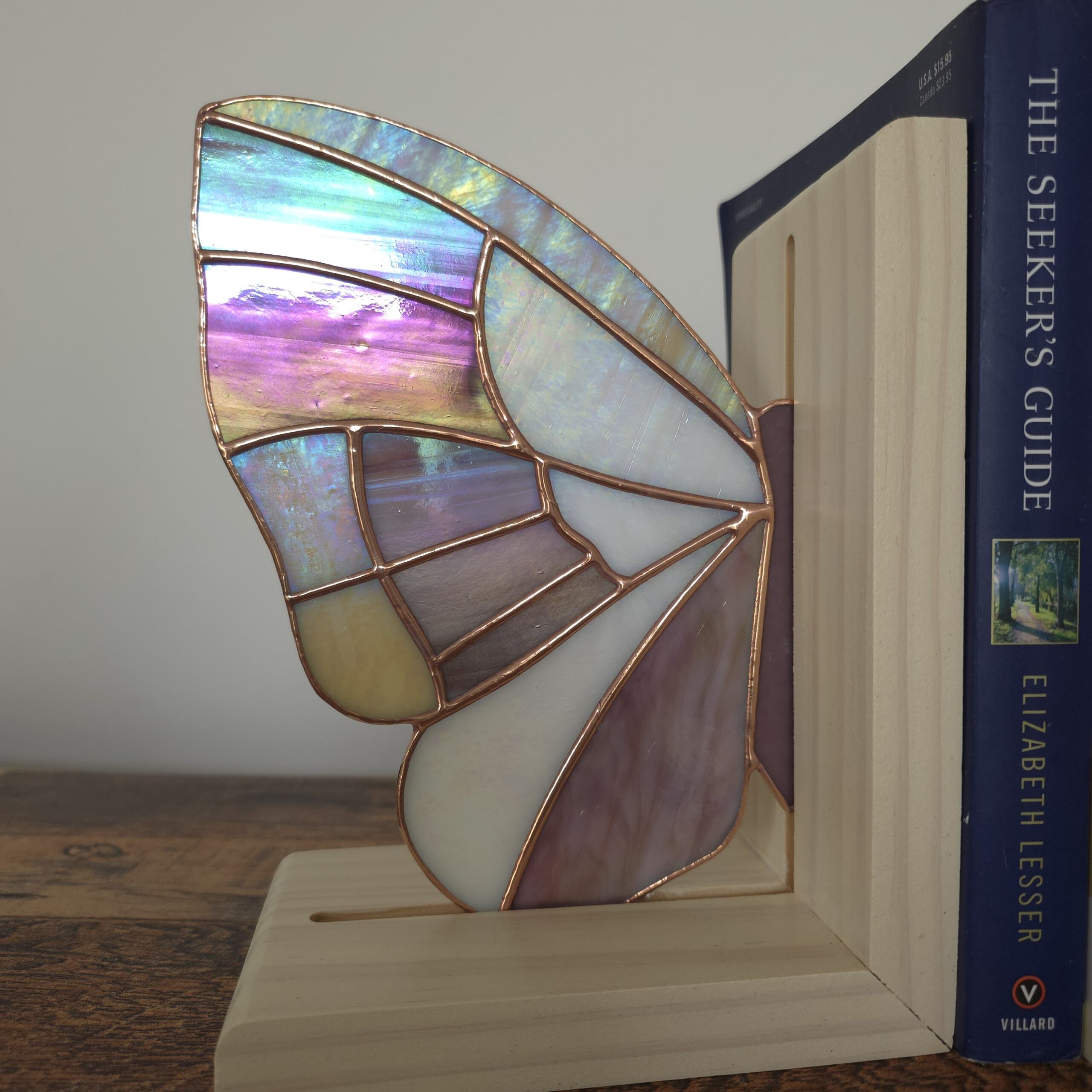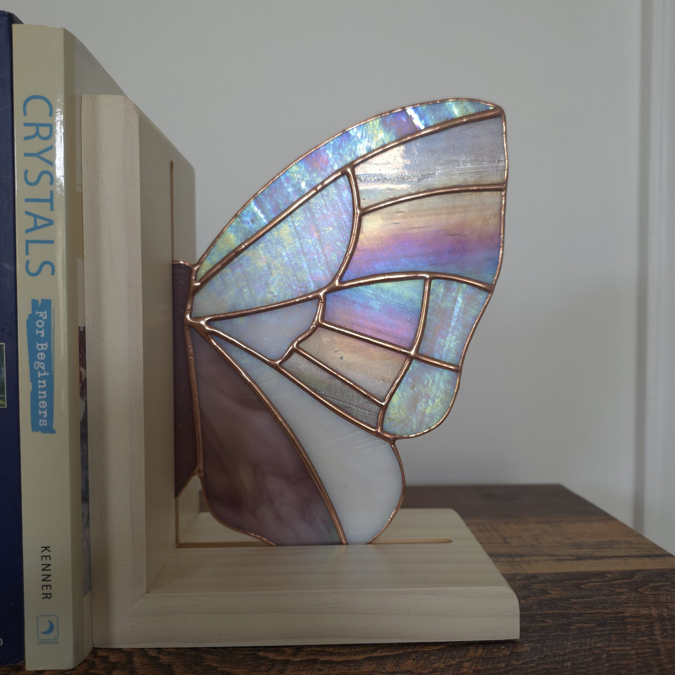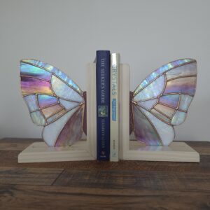 Handmade Stained Glass Butterfly Bookends. Features white, purple and amber iridescent glass. Metal is finished with a copper patina and polished to a shine. Wooden frames each measure 7×6″ and are finished with a whitewash stain.
