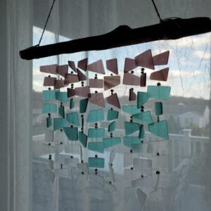 One of a kind, handmade sea glass mobile. Mobile/windchime is made from tumbled art glass and genuine fresh water pearls. Driftwood measures 17.5″ wide. Complete mobile is 13″ long. Braided hanging rope measures 28″ long.