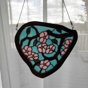 This one of a kind Cherry Blossom Suncatcher is made from gorgeous pink, yellow, green, light blue and brown textured glass. Finished glass art is set in a teak wood frame.